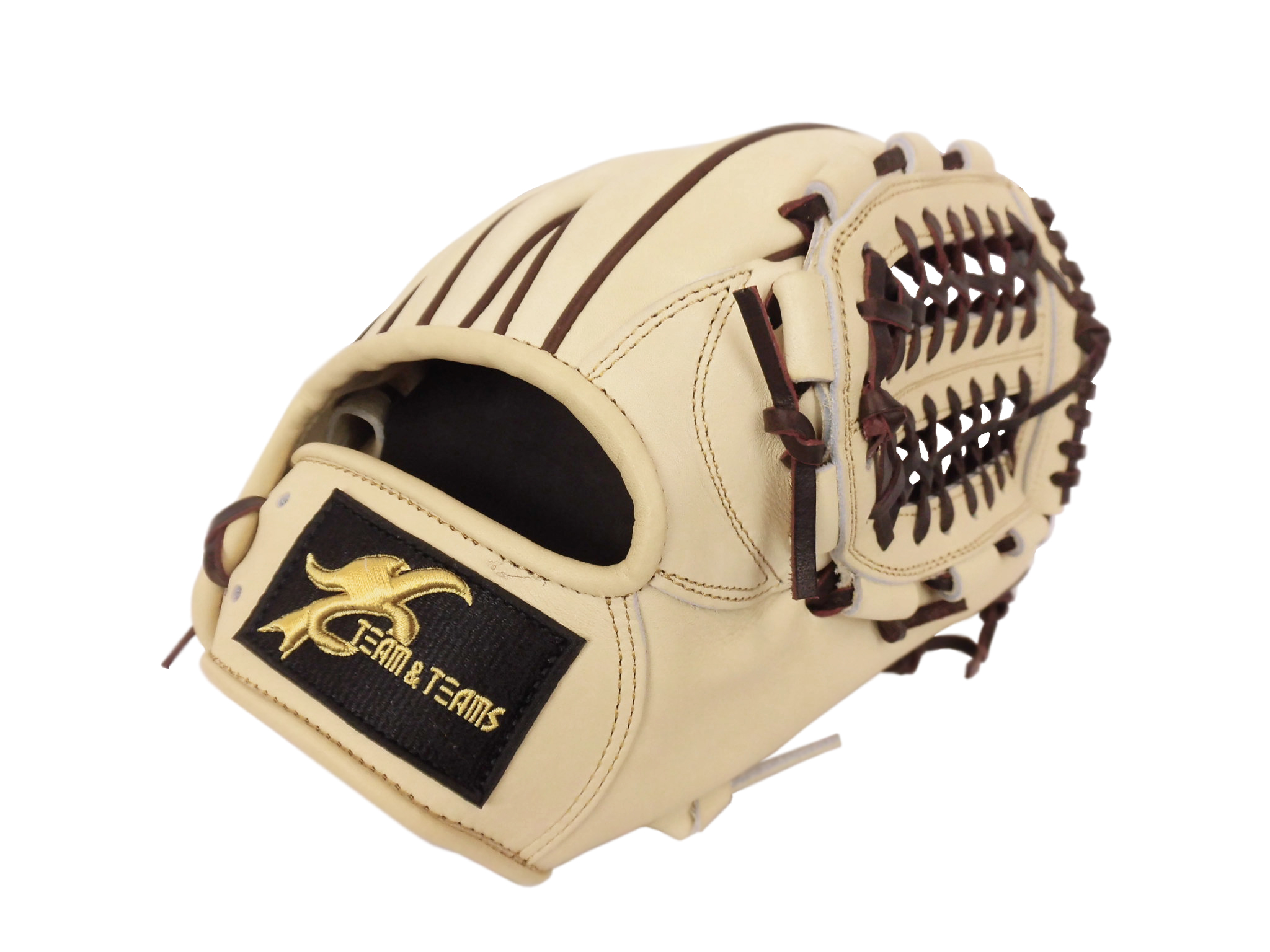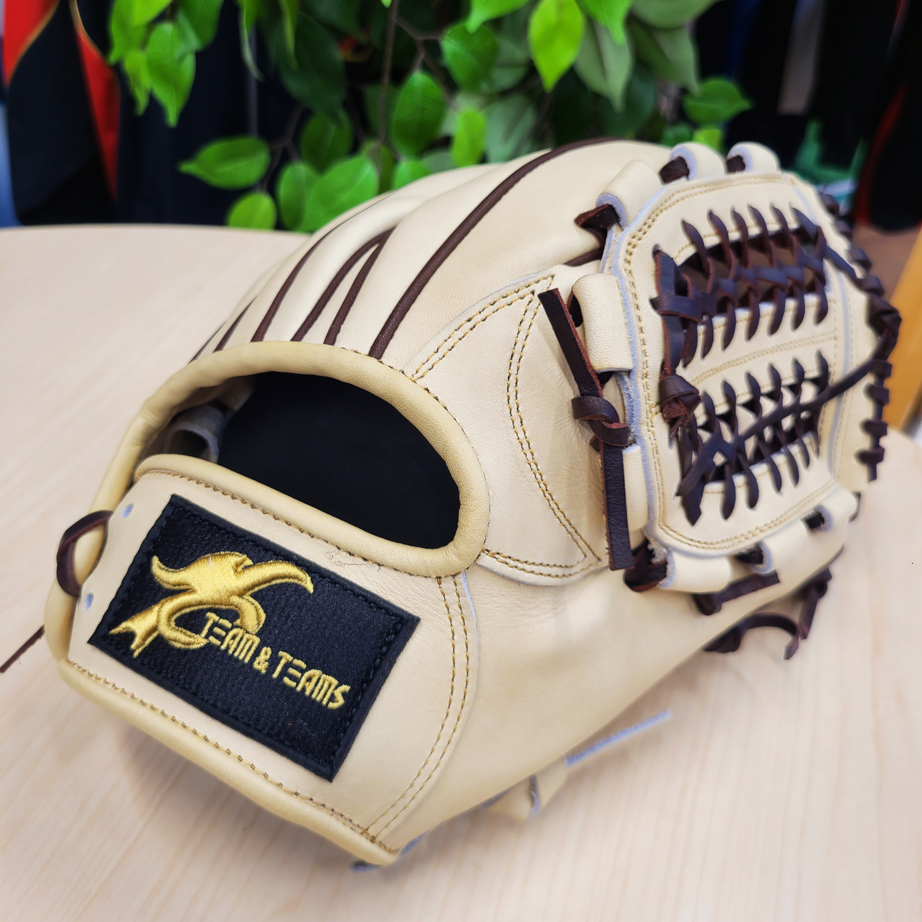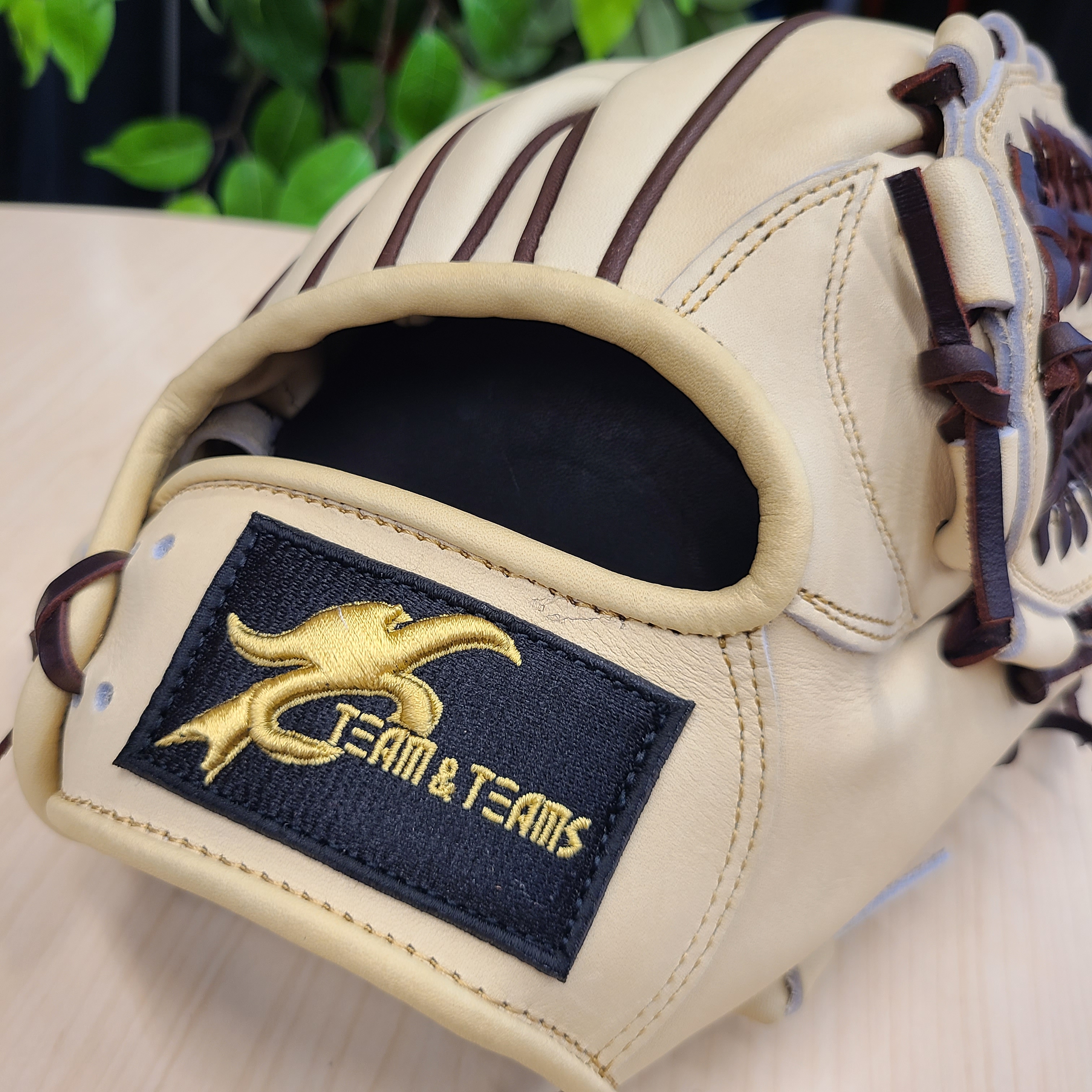 クリーム×ダークブラウンをベースに、ラベルはゴールドのTEAMSオリジナルラベルの湯本様オリジナルオーダーグローブが完成いたしました。