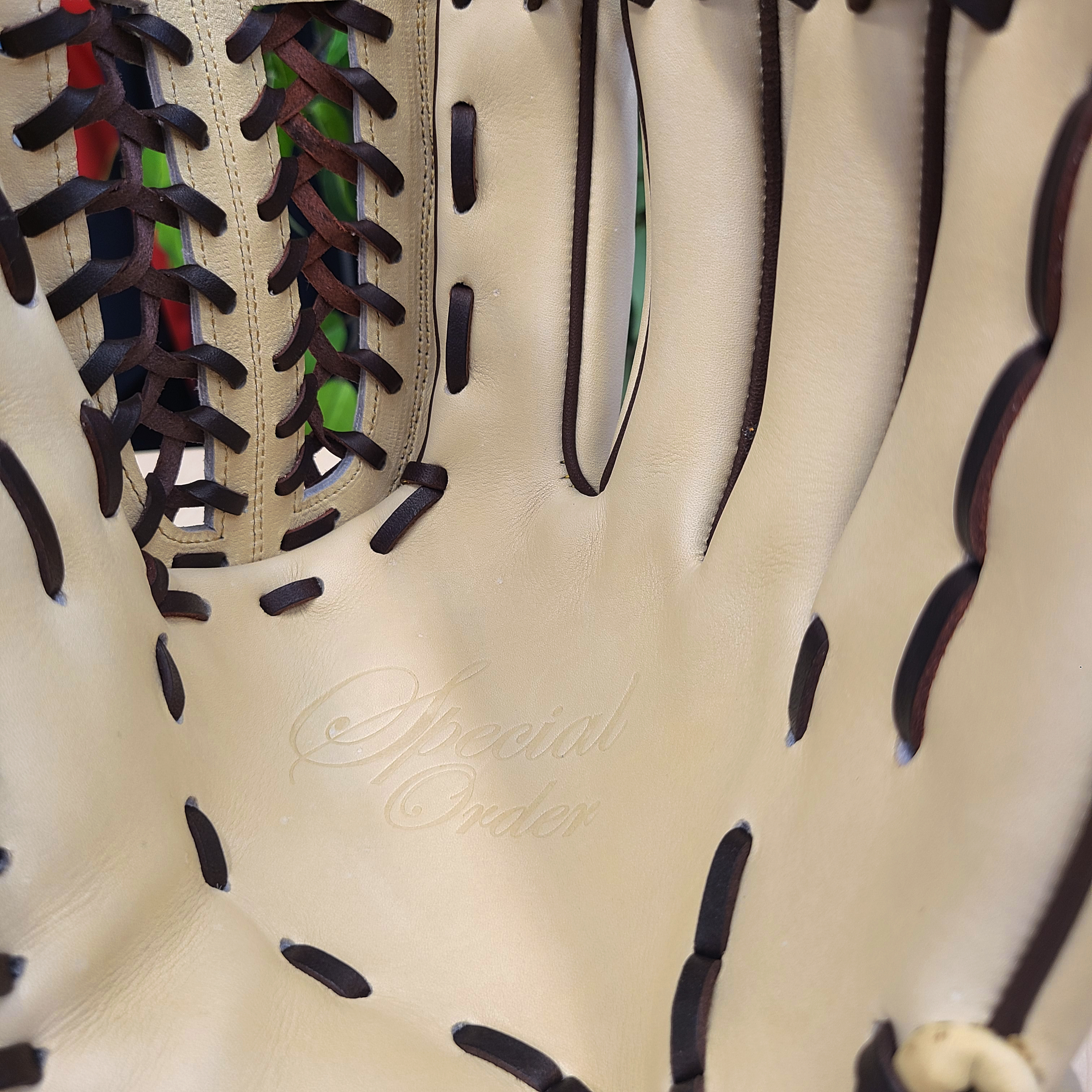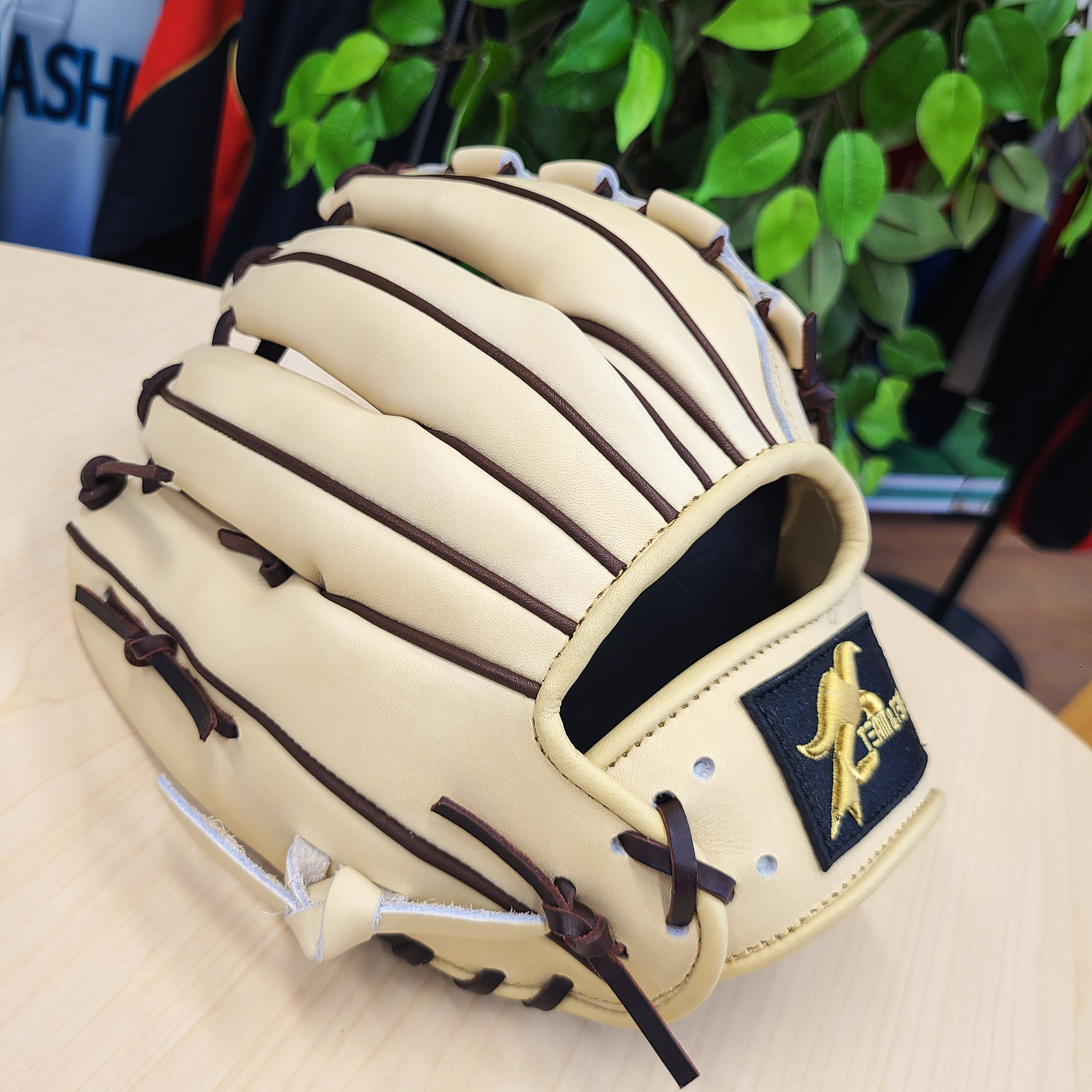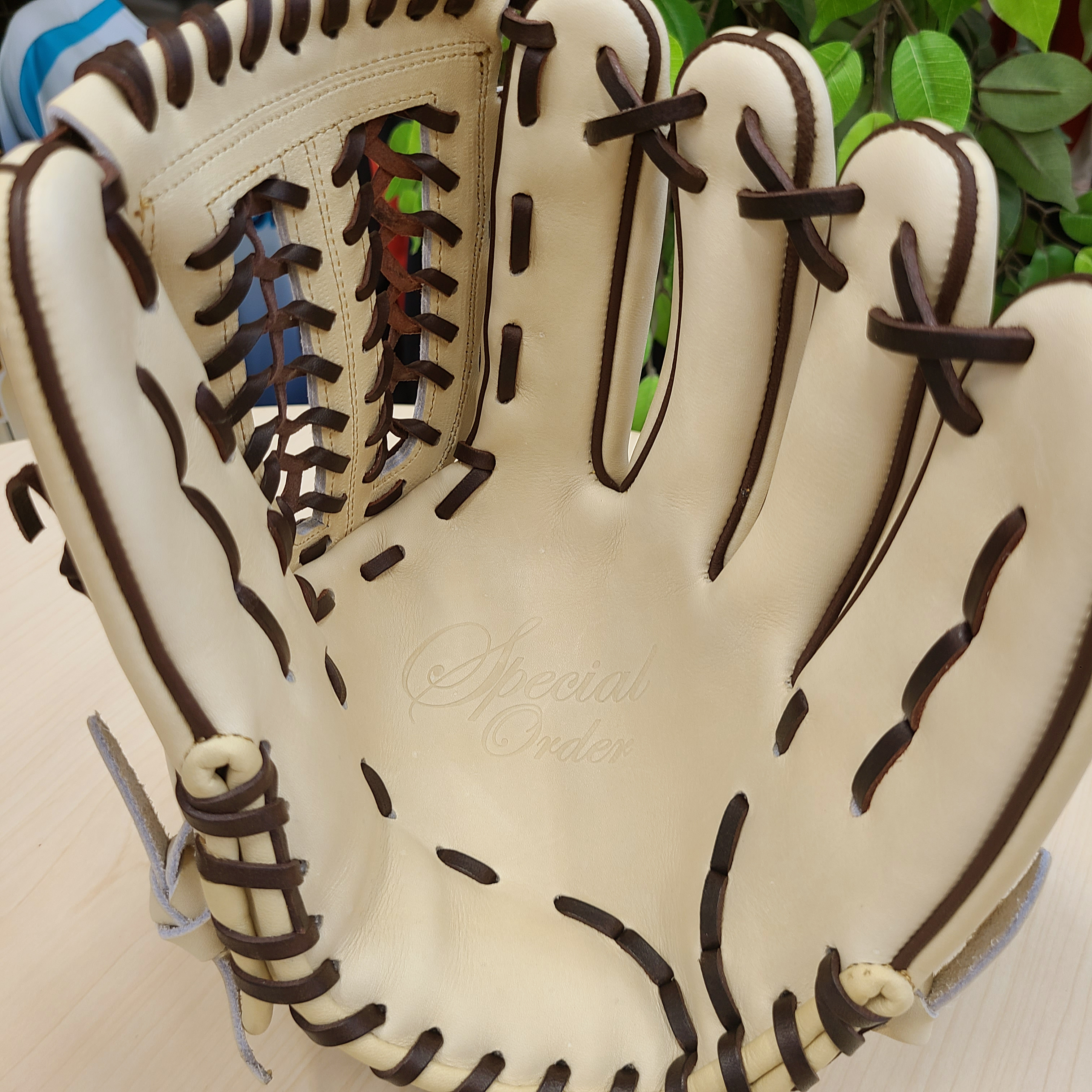 クリーム×ダークブラウンをベースに、ラベルはゴールドのTEAMSオリジナルラベルの湯本様オリジナルオーダーグローブが完成いたしました。